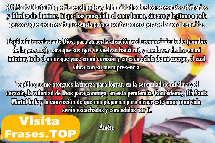 Querida Santa Marta, patrona de los imposibles y protectora de los corazones solitarios, acudo a ti en busca de tu poderosa intercesión. Tú, que fuiste capaz de vencer al dragón y convertirlo al cristianismo, te ruego que me ayudes a encontrar el amor verdadero.