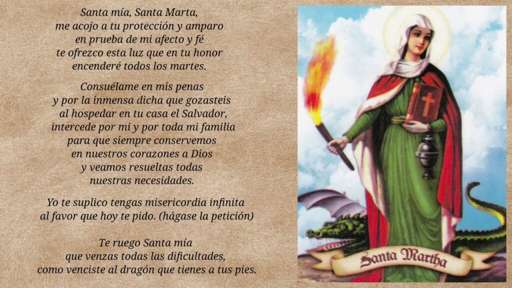¡Oh Santa Marta poderosa! Tú que venciste al dragón con la ayuda del Señor, te ruego que me ayudes a superar los obstáculos y desafíos que encuentro en mi camino.